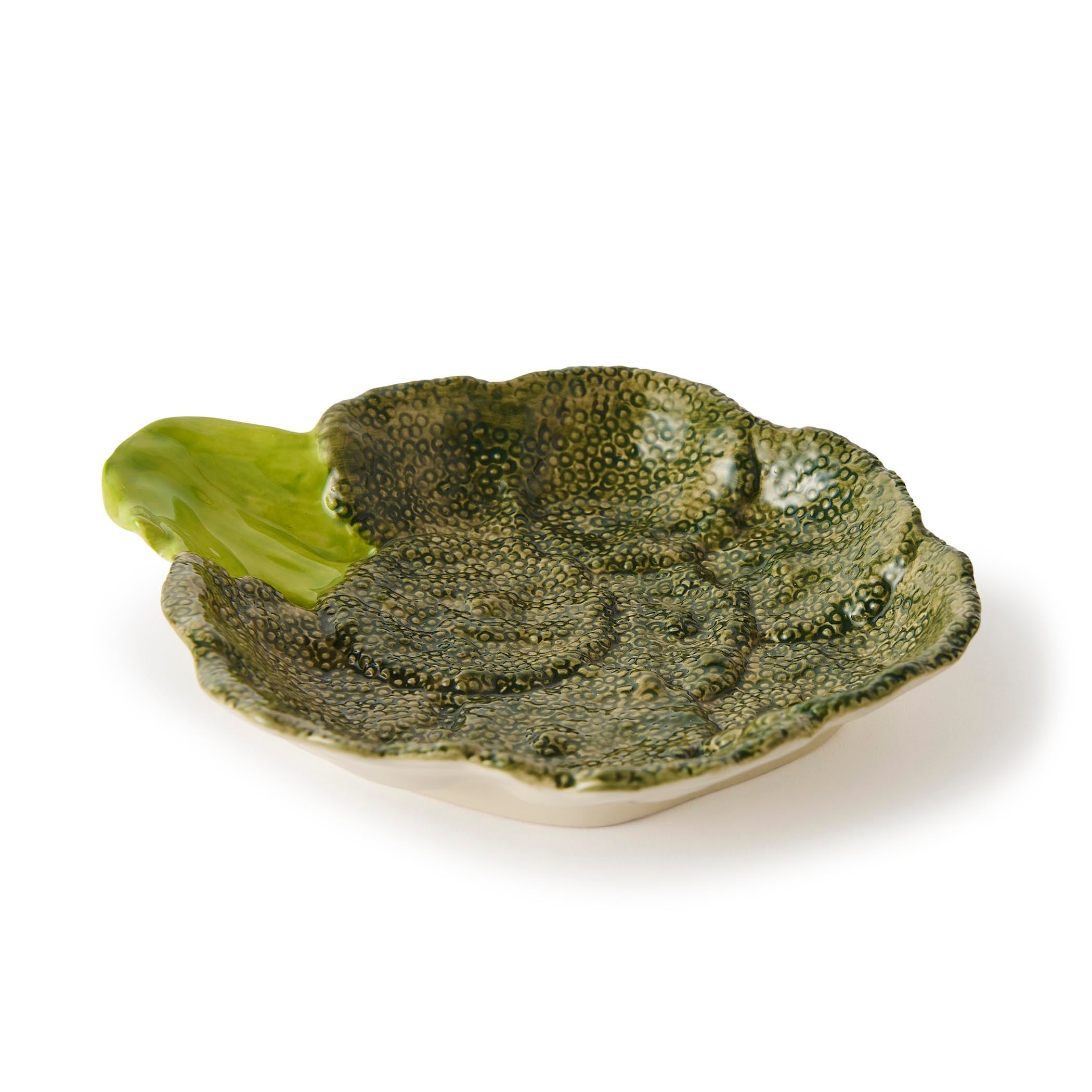 A whimsical broccoli-shaped plate that adds a fun, green touch to your table spread. Hand-painted and glazed in shiny and sharp colours with embossed details on the surface.