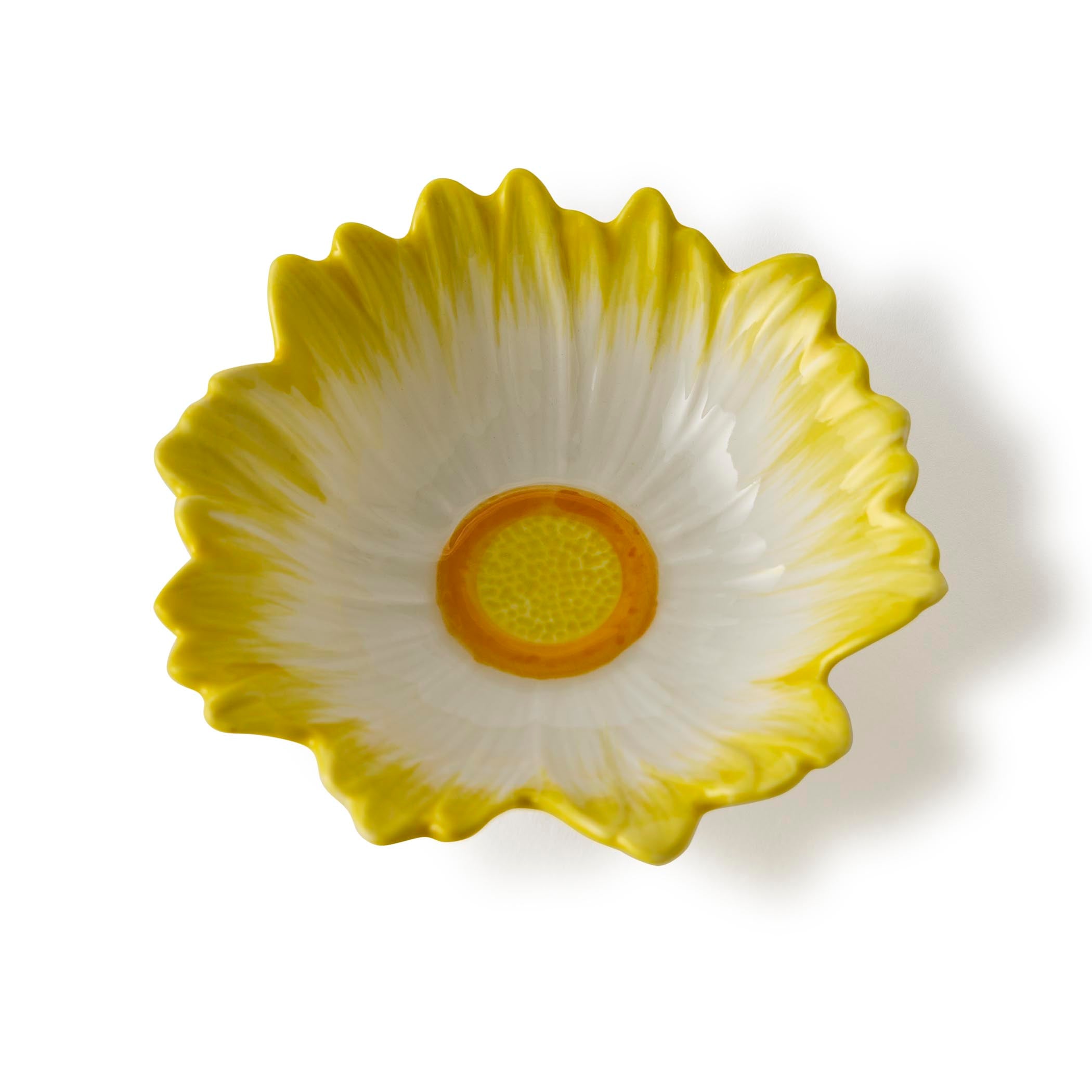 A delicate yellow flower-shaped ceramic dish ideal for holding jewellery or small treats. This hand-painted dish features an intricately embossed floral pattern that will brighten your table.